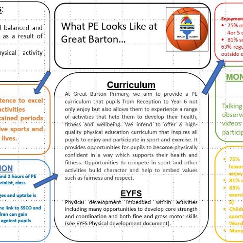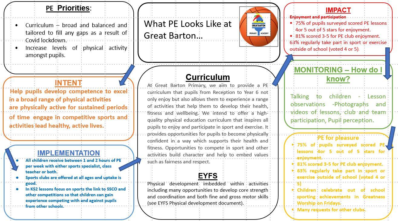 At Great Barton Primary, we aim to provide a PE curriculum that pupils from Reception to Year 6 not only enjoy but also allows them to experience a range of activities that help them to develop their health, fitness and wellbeing. We intend to offer a high-quality physical education curriculum that inspires all pupils to enjoy and participate in sport and exercise. It provides opportunities for pupils to become physically confident in a way which supports their health and fitness. Opportunities to compete in sport and other activities build character and help to embed values such as fairness and respect.